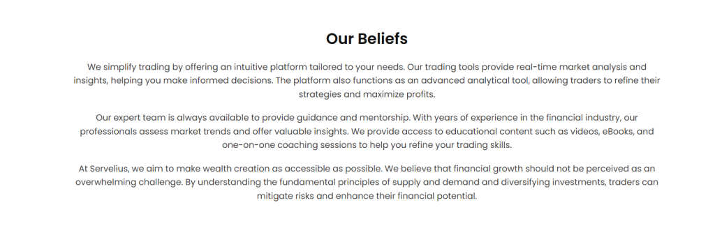 The company prioritizes user success over profit maximization strategies through a beginner-friendly approach that doesn’t sacrifice professional trading tools. A key point in this Servelius.com review is how this philosophy becomes evident in every platform feature, from the simplified interface design to the comprehensive educational resources that guide new traders through their learning journey while maintaining access to advanced analytical capabilities.